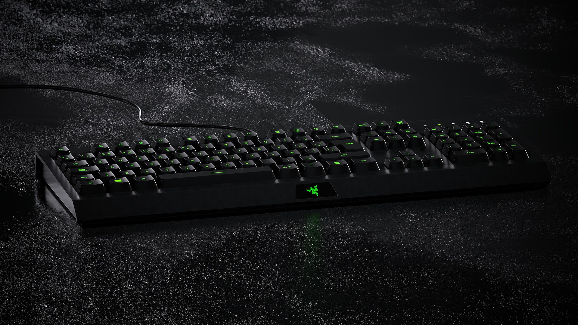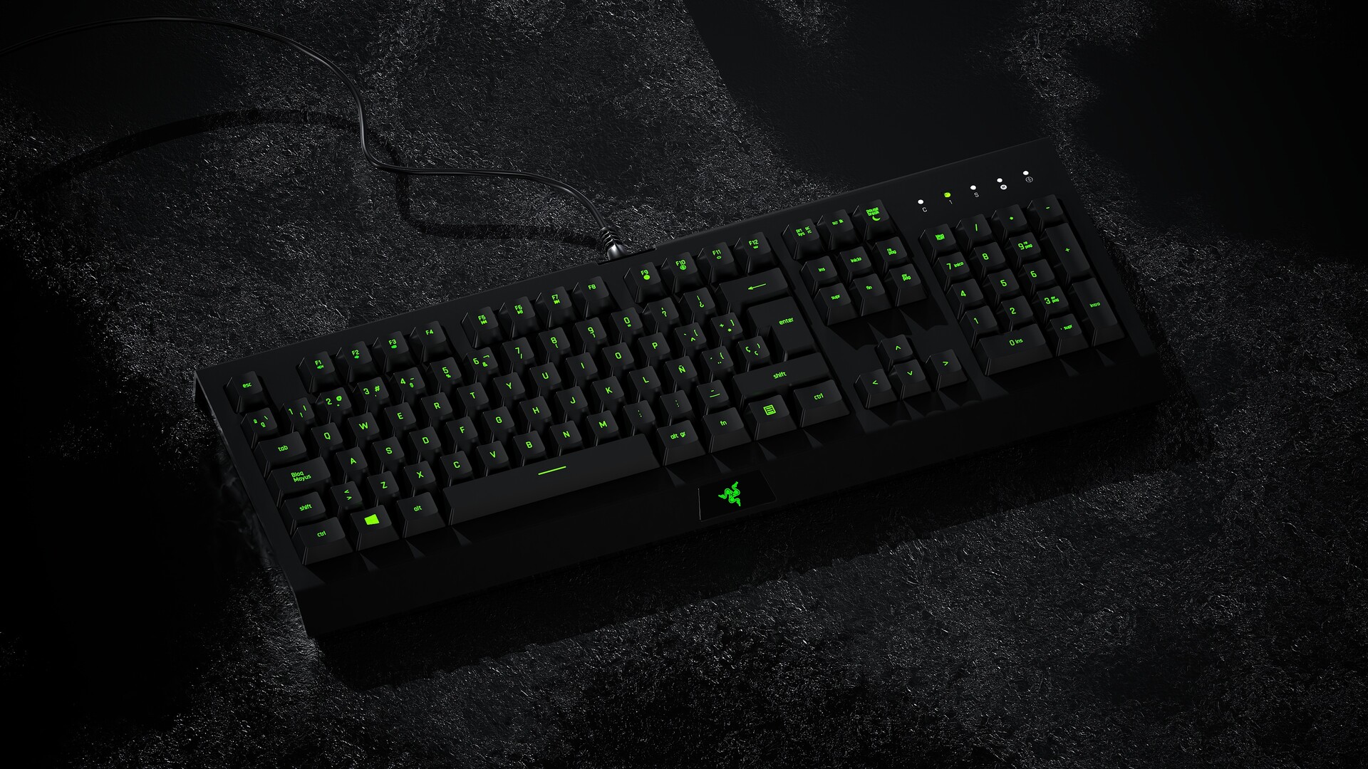 Apliqué materiales con acabados metálicos y plásticos para reproducir el aspecto característico de los periféricos de alta gama. Se trabajó la iluminación y los reflejos para destacar la retroiluminación verde y los detalles del logotipo, consiguiendo un contraste atractivo sobre un entorno oscuro.